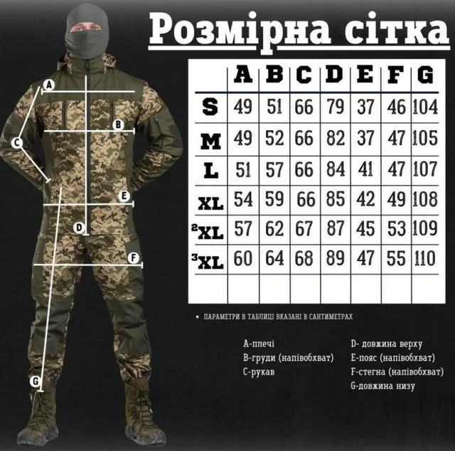 Костюм виготовлений з змішаної тканини в українському піксельному камуфляжі ММ-14 з оливковими вставками.