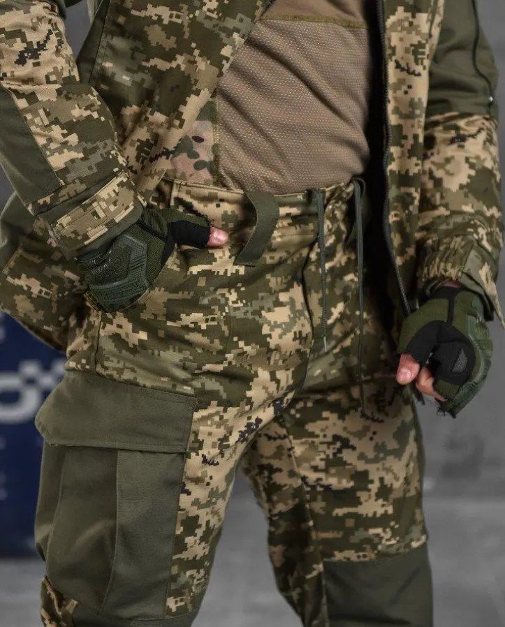 Костюм виготовлений з змішаної тканини в українському піксельному камуфляжі ММ-14 з оливковими вставками.