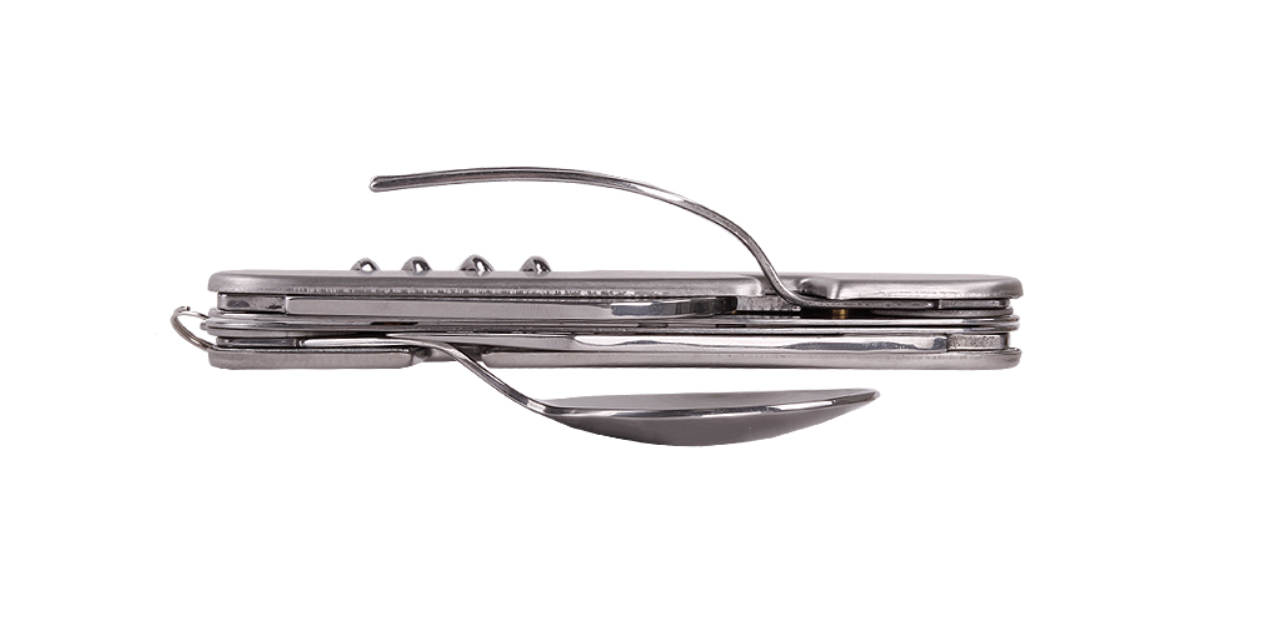 Розумна конструкція, що складається з двох частин, дозволяє одночасно використовувати кілька столових приборів на протилежних кінцях ножа. За допомогою кріпильного кільця його можна легко закріпити на одязі, рюкзаках, ремінцях чи інших елементах спорядження.