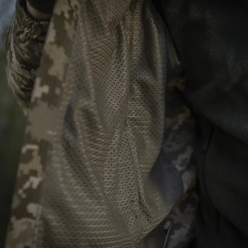 Завдяки вільному крою, куртку можна комбінувати з іншими видами одягу (термобілизна, флісова кофта тощо) при цьому не обмежуючи рухи під час активних фізичних навантажень. На фронтальній частині куртки розташовані дві великі кишені на застібках-блискавках, а також 3 велкро-панелі: 2 іменні над кишенями та одна по центру грудей, для кріплення звання.