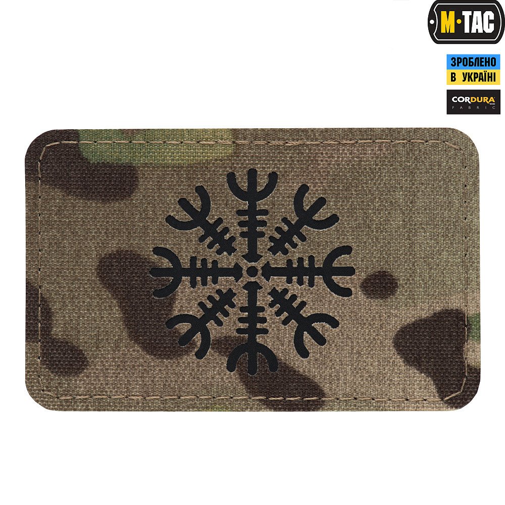 M-Tac нашивка Шолом Жаху Laser Cut із зображенням Егіш'ялм (Шолом жаху). Ісландський магічний знак на основі рунопису, використовувався в якості захисту від застосування сили, викликаючи почуття страху у противника. Егіш'ялм – амулет, що був популярним в ранньому Середньовіччі, переважно, у вікінгів і північних народів, що населяють територію сьогоднішньої Ісландії. Він відноситься до «шоломів жаху» – знакам, покликаним наганяти страх на ворогів і звертати їх до втечі. Нічого дивного, адже історія народів, а особливо історія вікінгів це, переважно, історія воєн – визвольних, загарбницьких, в процесі яких головною метою була перемога над противником.