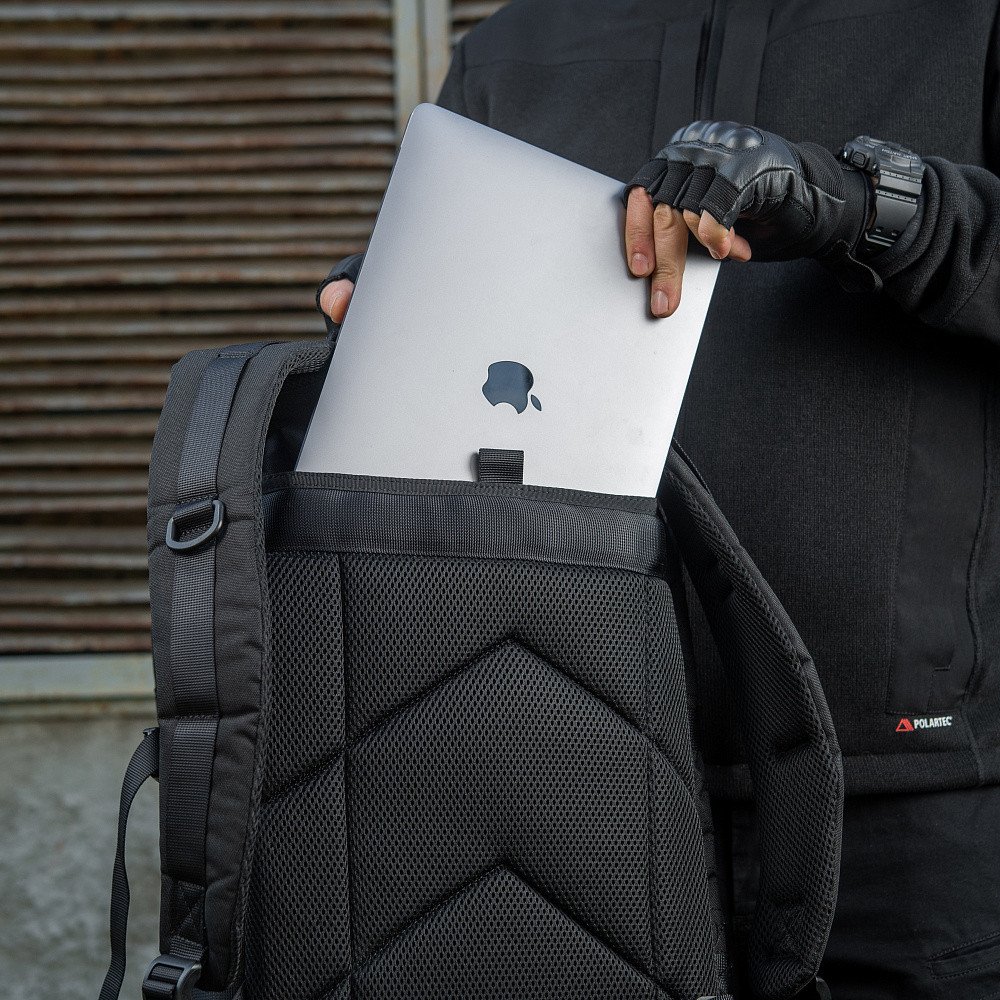 Рюкзак від бренду M-Tac Tac із системою кріплення Molle має два великих основних відділи на блискавках. Спереду розташовані дві додаткові кишені на блискавці. Ремені, для перенесення рюкзака за спиною, з м’яким наповнювачем і регулюються по довжині. Зі сторони спини є одна велика кишеня з дихаючою сіткою. Спеціалісти бренду M-Tac використали нову технологію зовнішнього кріплення модульних підсумків, замість звичайних нашивних PALS-строп, вирізавши лазером у шарі нейлону декілька рядів спеціальних отворів, які в свою чергу, дозволяють кріпити стандартні підсумки з MOLLE-кріпленням і знижують загальну вагу виробу приблизно на 35%.