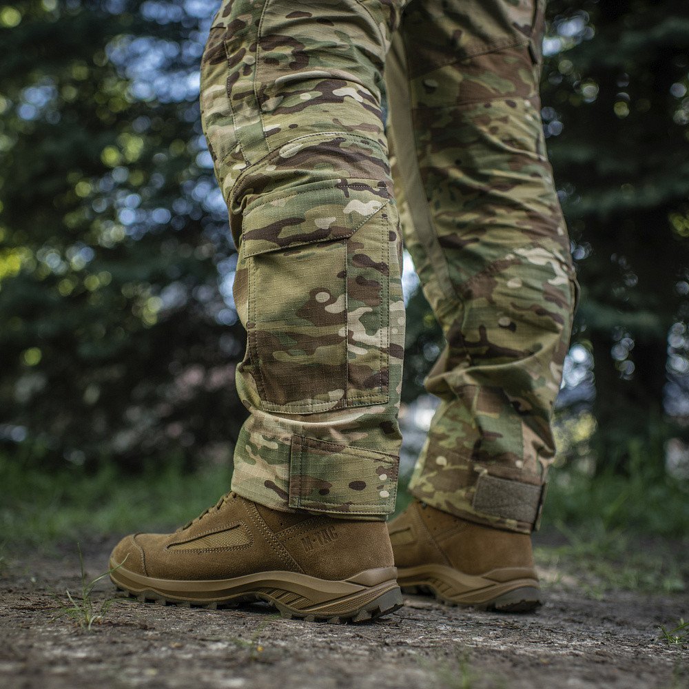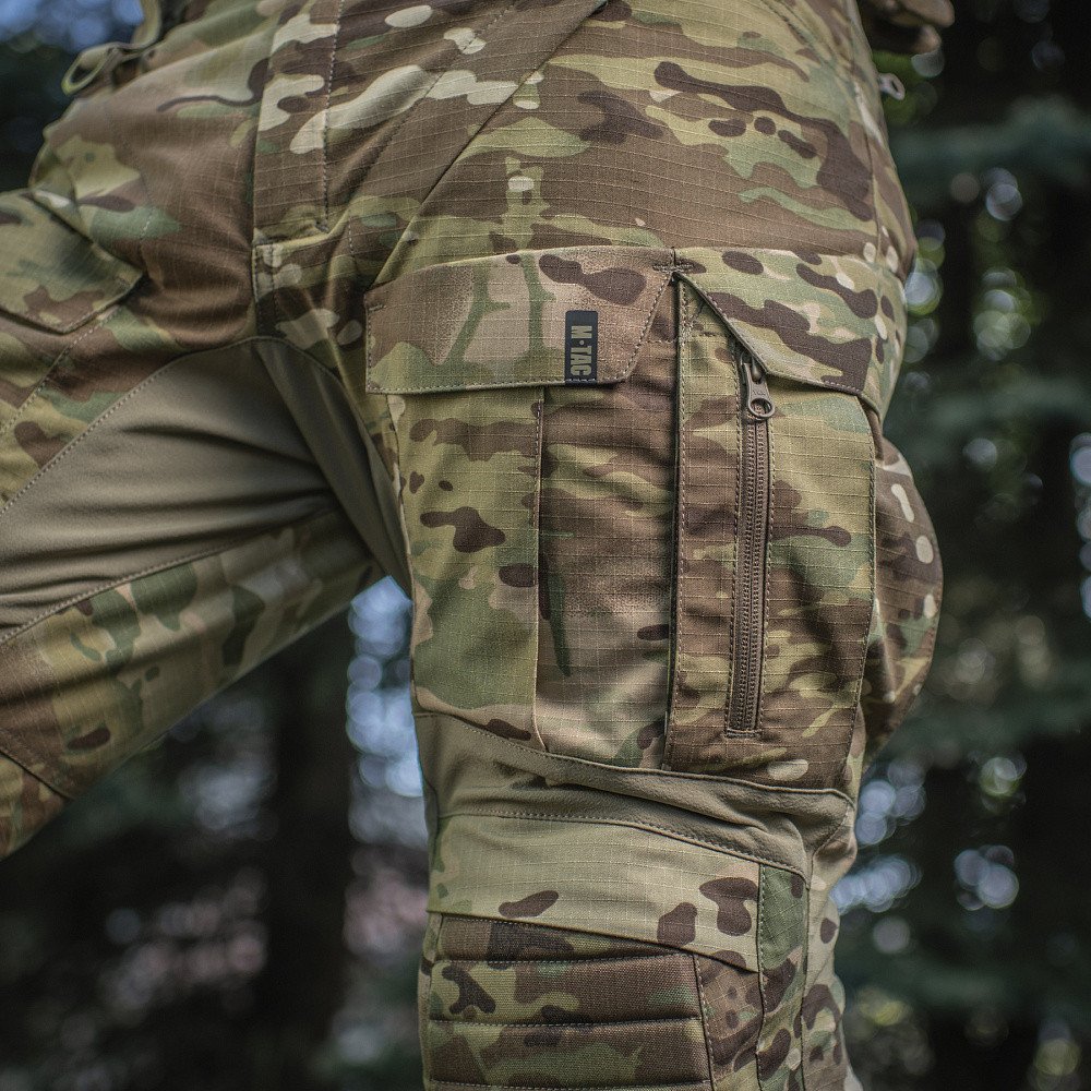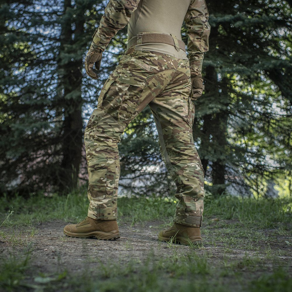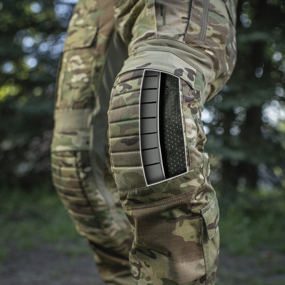 Штани пошиті з високоякісної тканини “Ріп-стоп” (бавовна, поліестер), що гарантує міцність та високі показники повітропроникності. Саме такої якості тканина йде на пошиття уніформи для військових Британії. Вставки з легкої тканини Flex (нейлон, еластан) тягнуться у всіх напрямках (4-way stretch) та гарантують комфорт при активній експлуатації. В області колін дизайнери бренду використали Cordura 500D зі стаціонарно простроченими вставками з EVA-піни товщиною 2-4 мм, що забезпечить ефективний захист колінних суглобів від ударів та механічних пошкоджень. Дана модель додатково комплектується наколінниками.