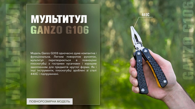 Мультитул G106, випущений компанією Ganzo, являє собою повнорозмірний і дуже практичний інструмент. Він буде корисний мандрівникам, туристам і любителям активно відпочивати на природі. Основна його перевага-максимальна функціональність при досить невеликій вазі.