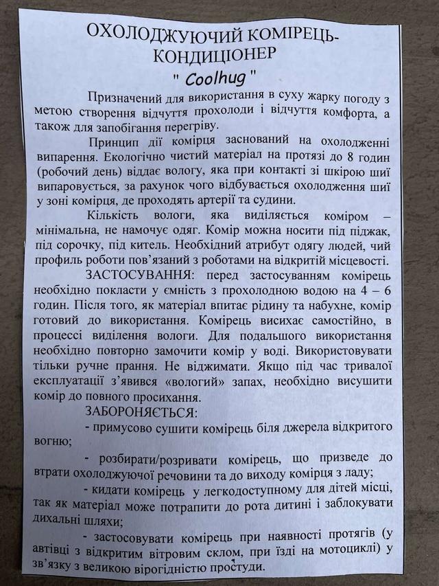 Комір забезпечує прохолоду та комфорт навіть у найспекотнішу літню погоду. Це доступний охолоджувальний судин шиї. Комір містить удвічі більше кристалів, які поглинають холодну воду в 100 разів більшу за власну вагу.