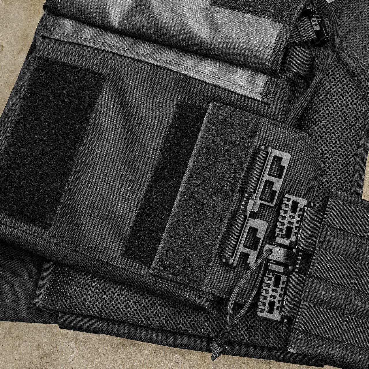 На фронтальній частині виробу знаходиться Velcro-панель з прорізами, на яку можна закріпити молле-сумісне спорядження та ID-ідентифікатори.