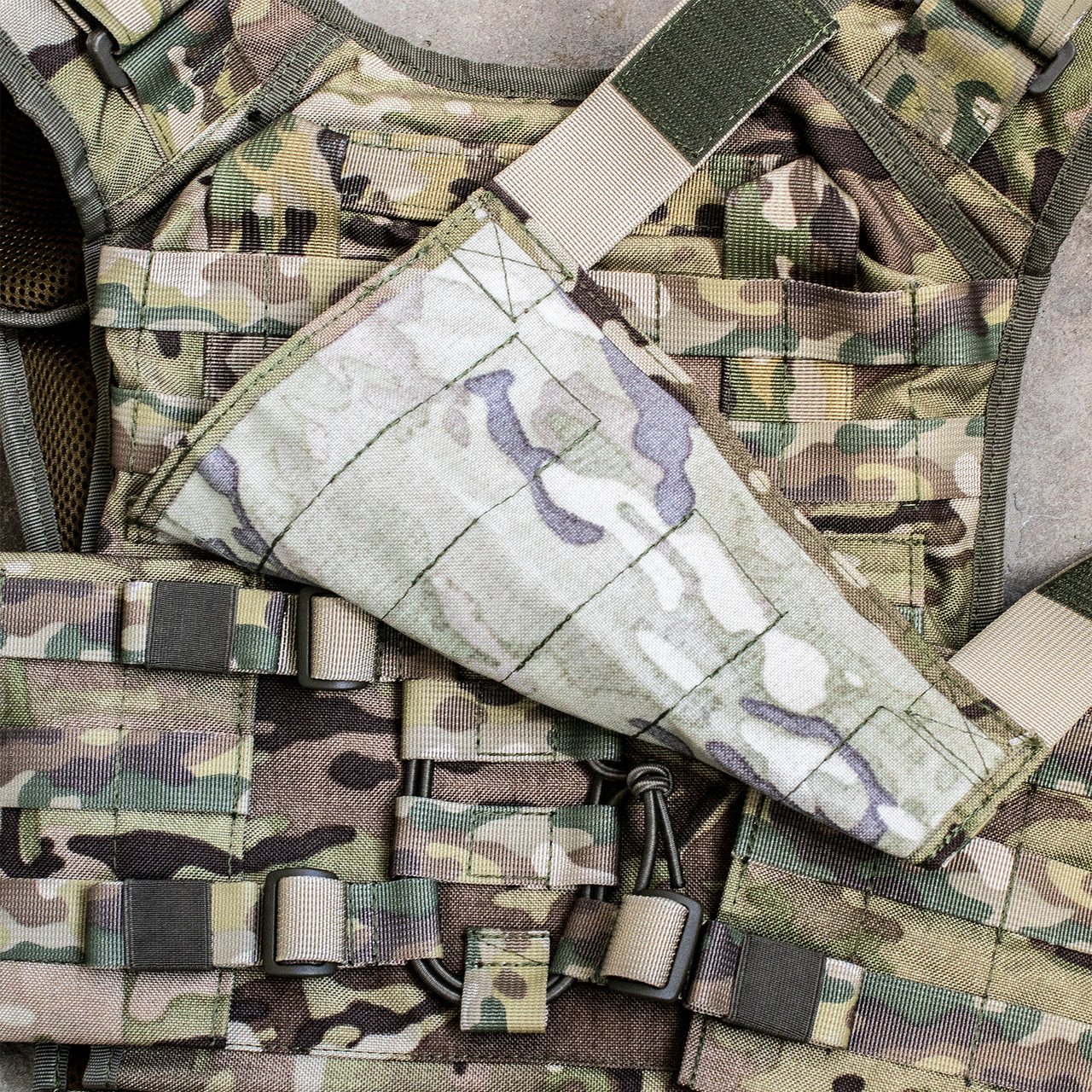 - MOLLE система: Чохол обшитий стропами MOLLE по всій площі, що дозволяє кріпити додаткові підсумки та спорядження в зручних місцях