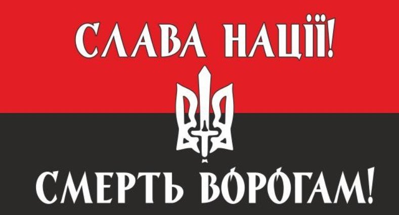 До прапора УПА по центру в два рядки додана напис: «СЛАВА НАЦІЇ, СМЕРТЬ ворогам!».