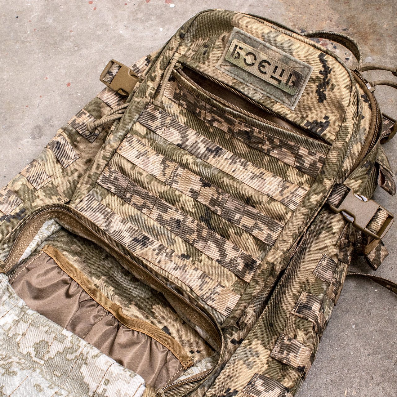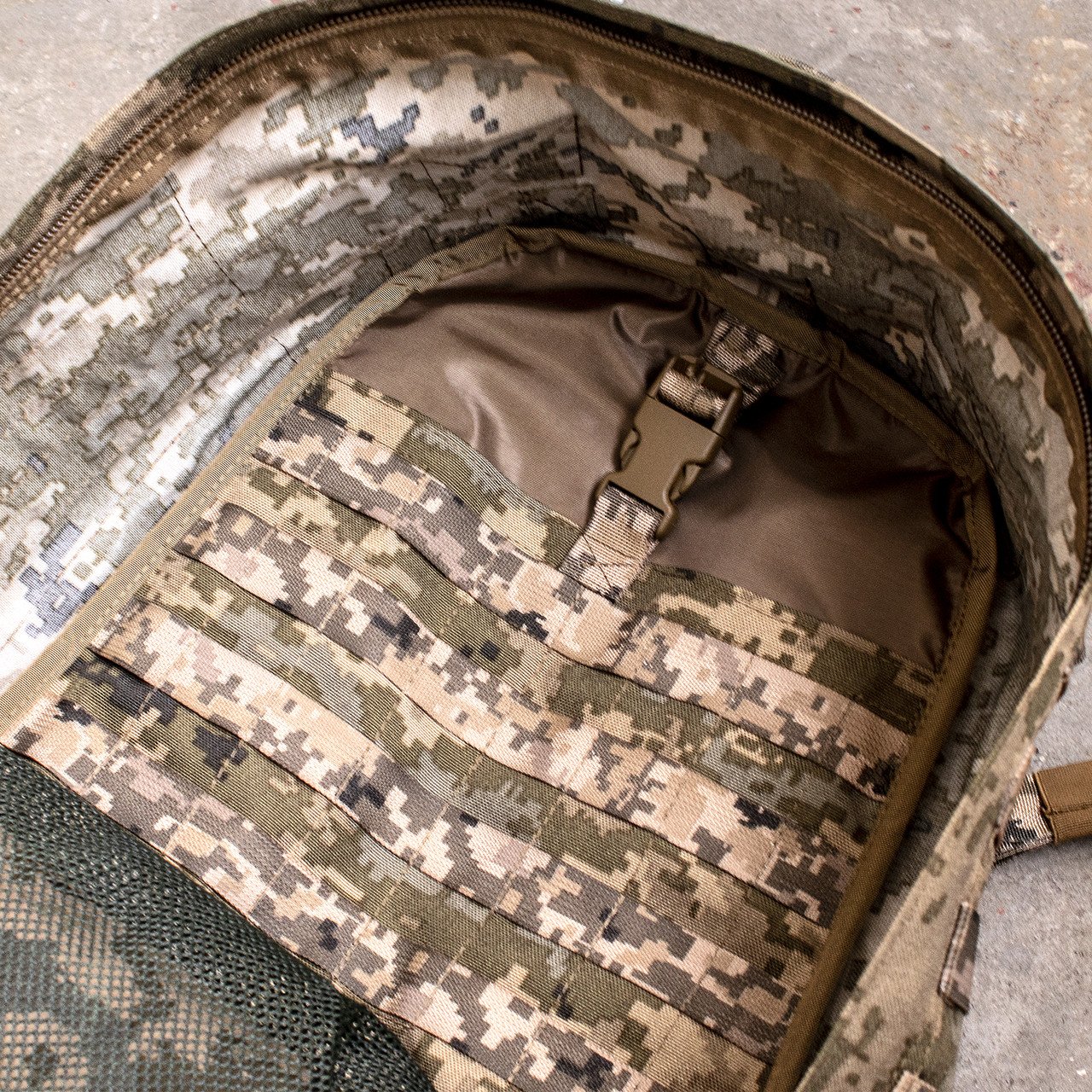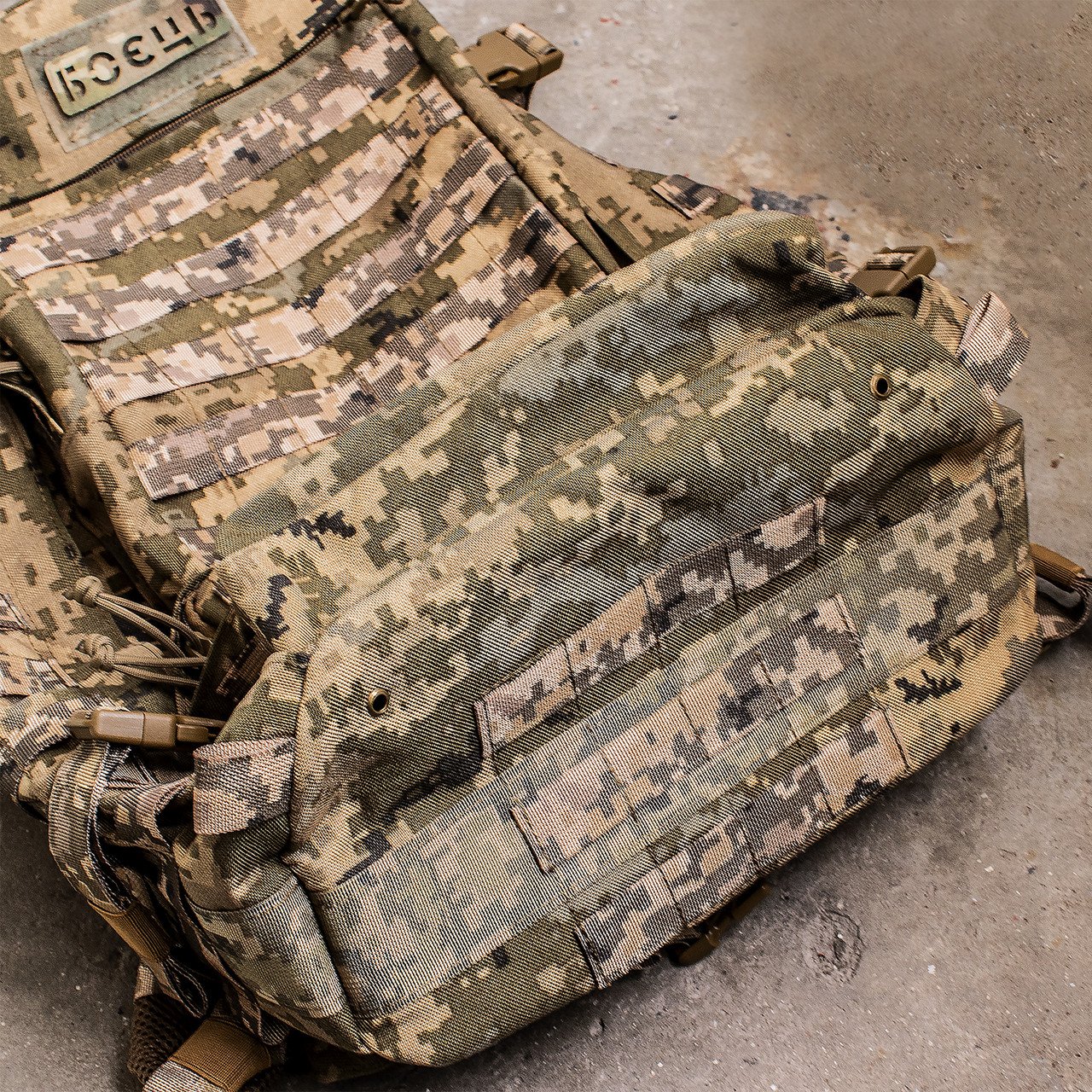Спереду та з боків рюкзак оснащений системою MOLLE, яка дозволяє за потреби збільшити об’єм, прикріпивши додаткові підсумки.