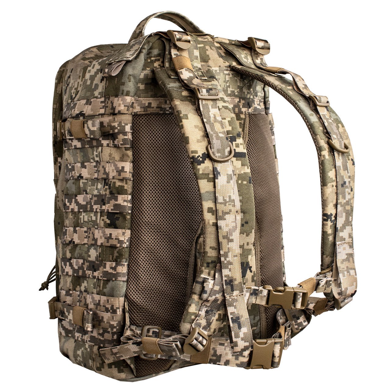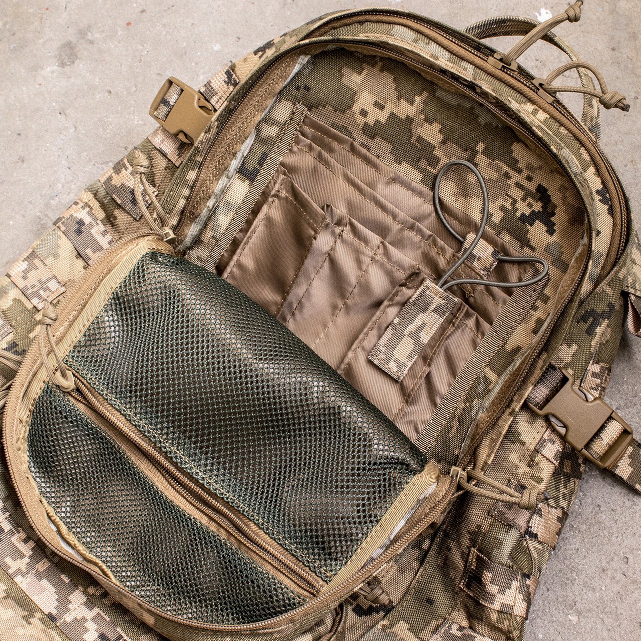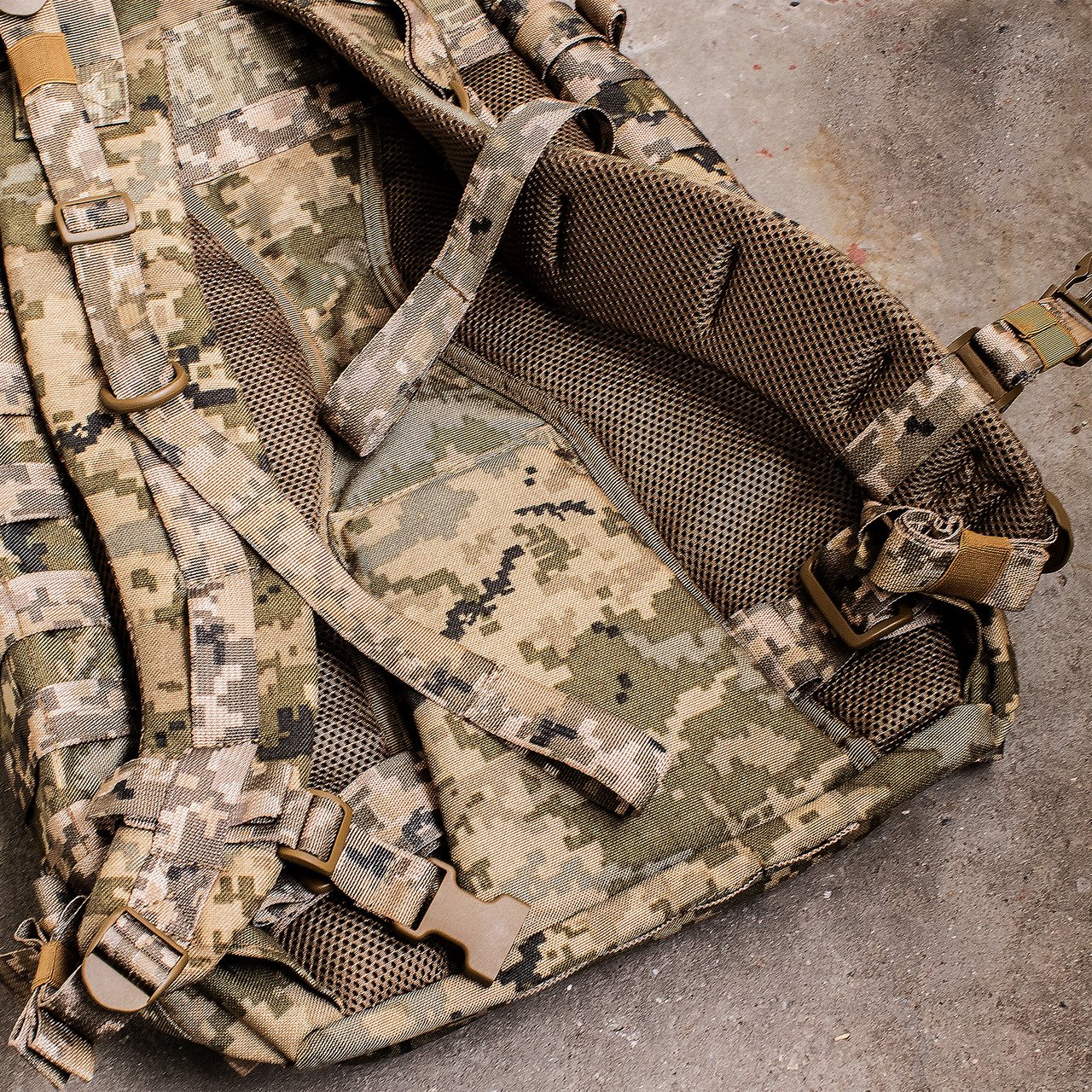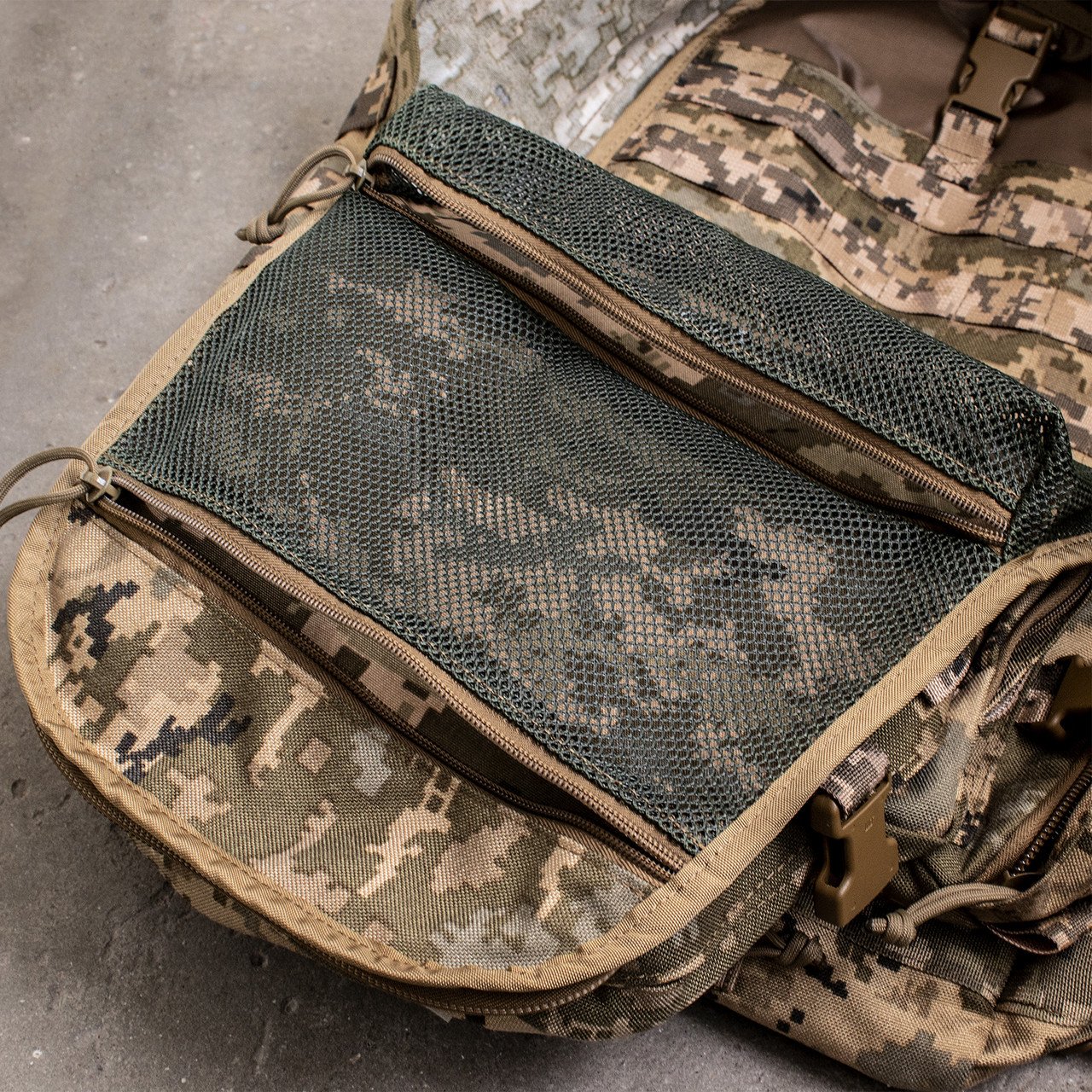 Спереду та з боків рюкзак оснащений системою MOLLE, яка дозволяє за потреби збільшити об’єм, прикріпивши додаткові підсумки.