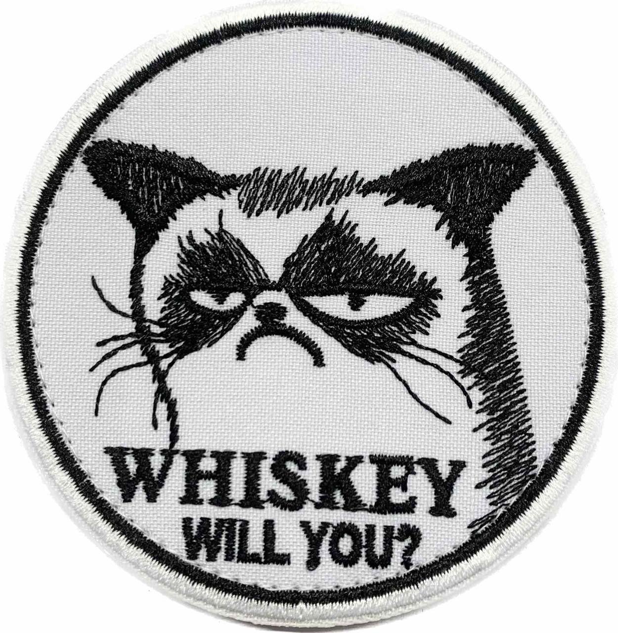 Шеврон із зображенням похмурого кота в стилі Grumpy Cat з текстом "WHISKEY WILL YOU?". Чорно-білий дизайн додає стилю та підкреслює вираз обличчя кота. Ідеально підійде для любителів гумору та військової тематики.