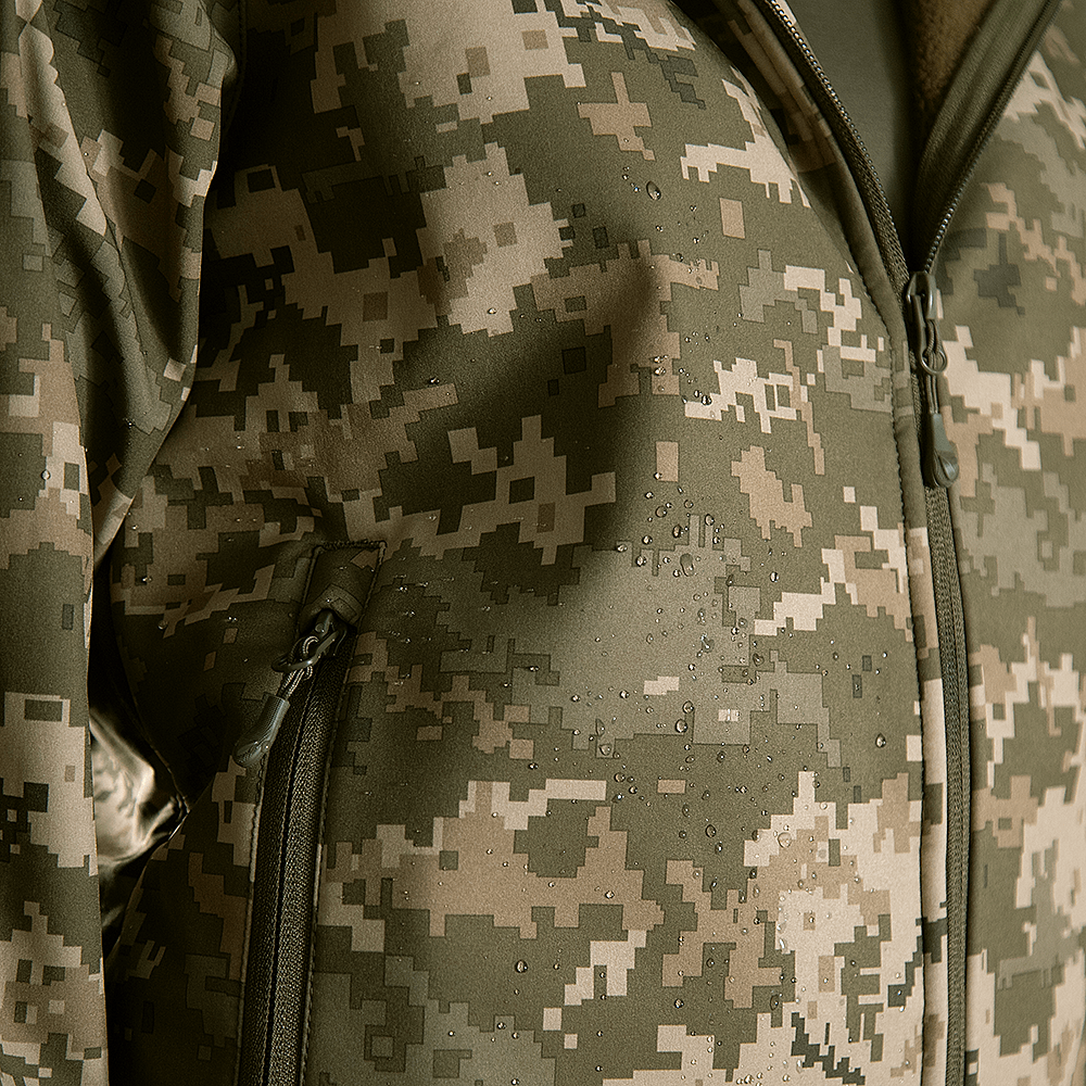 Куртка вироблена з оригінальної тканини SoftShell. Це легка, сучасна тканина зі справжньою безпоровою мембраною, яка складається з трьох шарів: мікрофліс який зберігає тепло; мембрана що захищає від вітру та вологи; еластичний поліестер із вологостійким просоченням, який захищає від пилу, бруду й вологи.